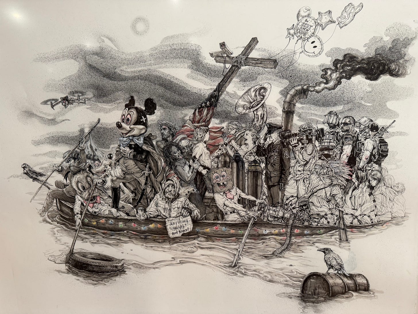 I guess it’s a version of the American story ... from drones and Donald Duck on the left; through Jesus Christ, a homeless man, and Sponge Bob Square Pants in the center; to American Indian children and amped up police on the right. There’s a lot to take in and consider. But importantly, they are on a raft together, suggesting that their fates are intertwined, like it or not.