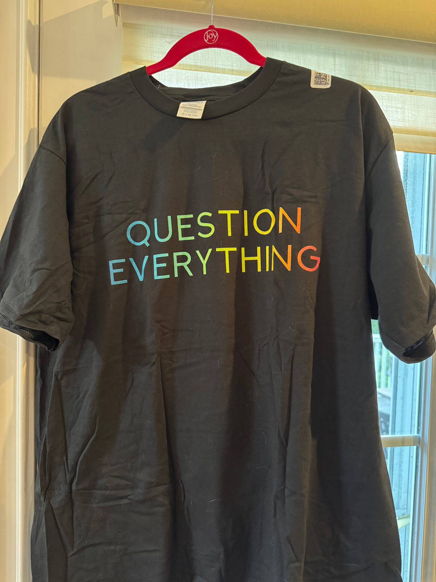 I am pleased to introduce you to my new T-shirt. It speaks volumes about what I am feeling, thinking, and experiencing these days. It also underscores how much I value the ability to question -- which I do not take for granted.